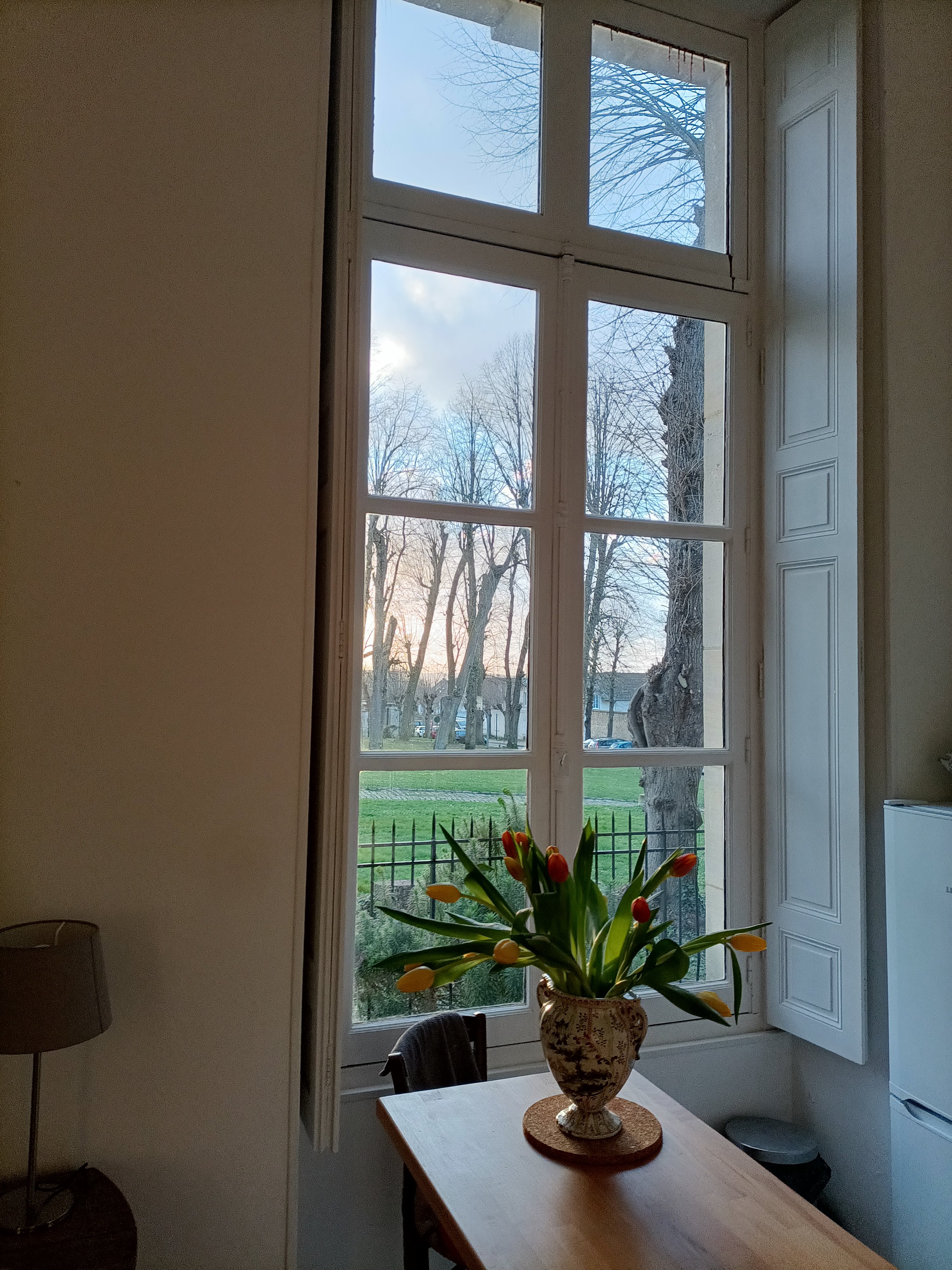 As I write, I look out two high windows beneath a ceiling nearly 15 feet high. Outside is the village green lined with two rows of linden trees, still bare at this time of year. Inside, to my left there is a maroon and gray-flecked marble fireplace, its hearth without a fire, unfortunately. For the moment, I’m basically living without heat. I haven’t yet had time to meet with the heating specialists!
